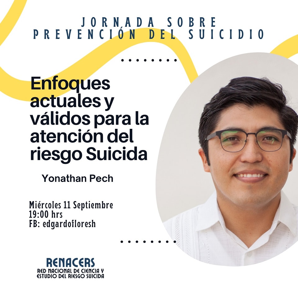 El pasado miércoles 11 de septiembre, participé en la Jornada sobre Prevención del Suicidio con una charla titulada Enfoques actuales y válidos para la atención del riesgo suicida. Representé a la Asociación Yucateca de Suicidología, A.C., y hablé sobre enfoques basados en evidencia que han desarrollado protocolos y métodos efectivos para reducir el riesgo de intento suicida. La transmisión se realizó a través de la fan page de Edgardo Flores y fue parte de las actividades organizadas por RENACERS, en el marco conmemorativo del Día Mundial para la Prevención del Suicidio.