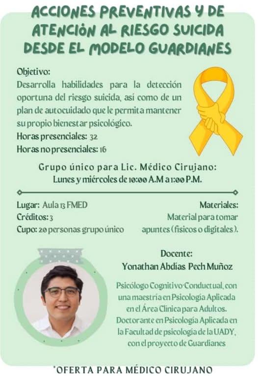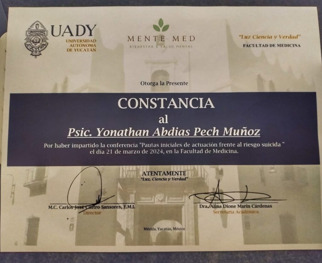 También quiero expresar mi gratitud a la Asociación Yucateca de Suicidología por la confianza de permitirme representarla en este espacio de reflexión y diálogo sobre la prevención del suicidio.